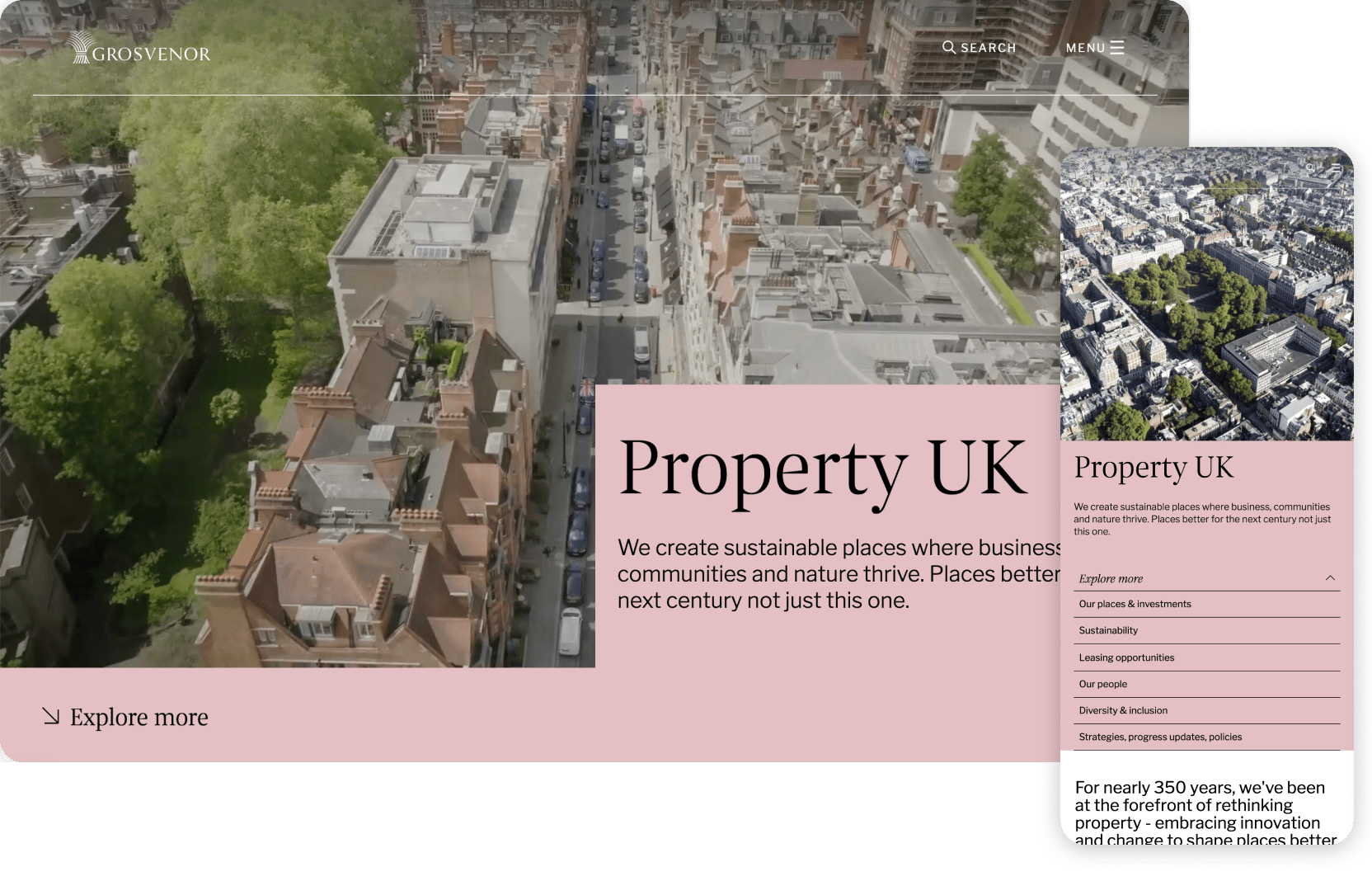 The focus in building the Grosvenor Group website was on brand execution. We worked alongside Grosvenor’s branding partner, Dragon Rouge, to create a digital experience that conveyed the new brand design.